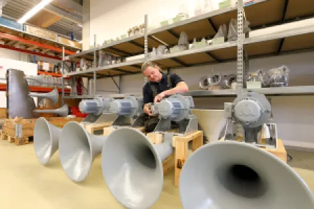 The ZET-Horn essentially consists of a piston inside a cylinder driven by an AC 3-phase motor and a joining sound horn. The piston oscillates at a certain frequency making the air inside the sound projector vibrate in resonance to produce a clean sound audible over a wide range. Higher amplitudes of the harmonics ensure best possible penetration of the normal background noise level on board. The ZET-Horn has a run-up time of less than 0.15 seconds which guarantees a pure, concentrated sound with best directional properties.